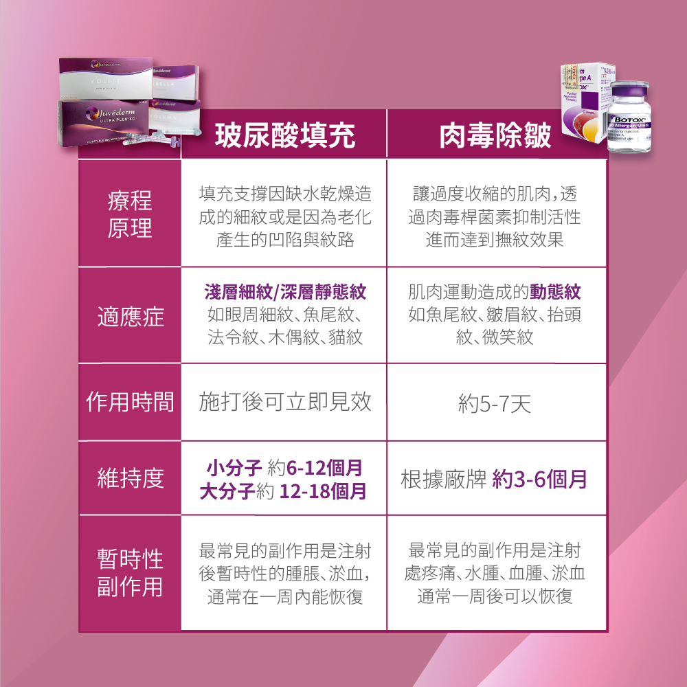 •  常見的品牌有 保妥適Botox、彩虹肉毒Nobata(娜柏塔)、魔皺肉毒Letybo(保提拉)
