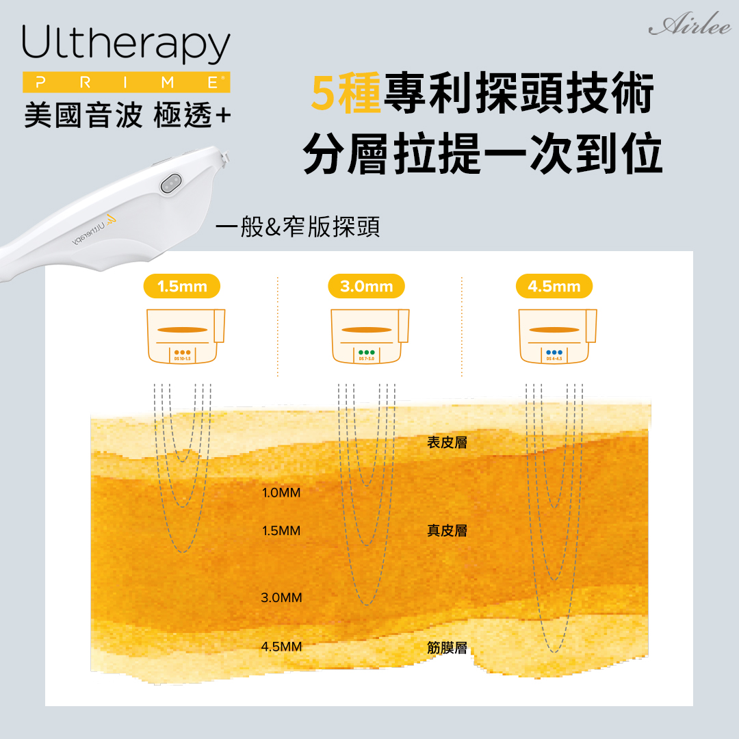 更提供窄版探頭的設計,可依照治療區域與個人膚質需求,選擇適合的探頭,不管是輪廓線、或是細緻的眼周、眉眼,都能達到更精準的拉提效果。