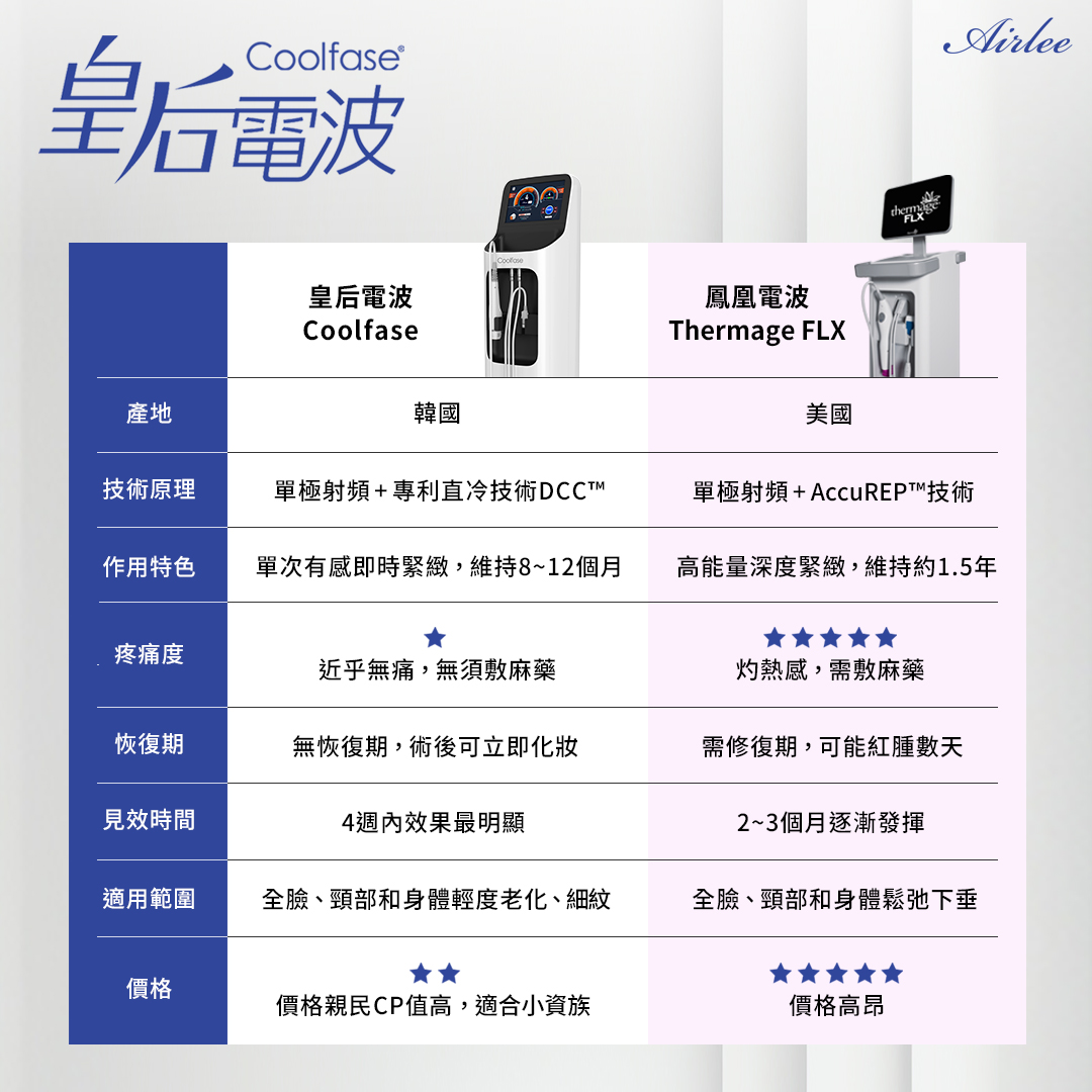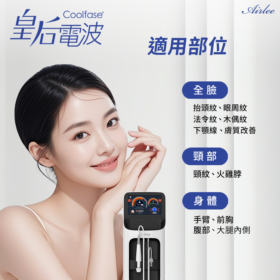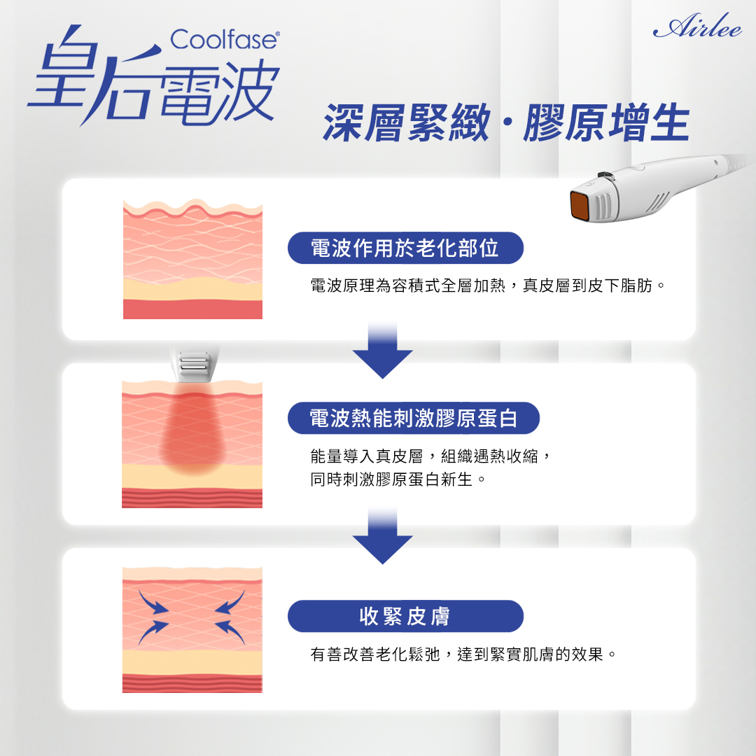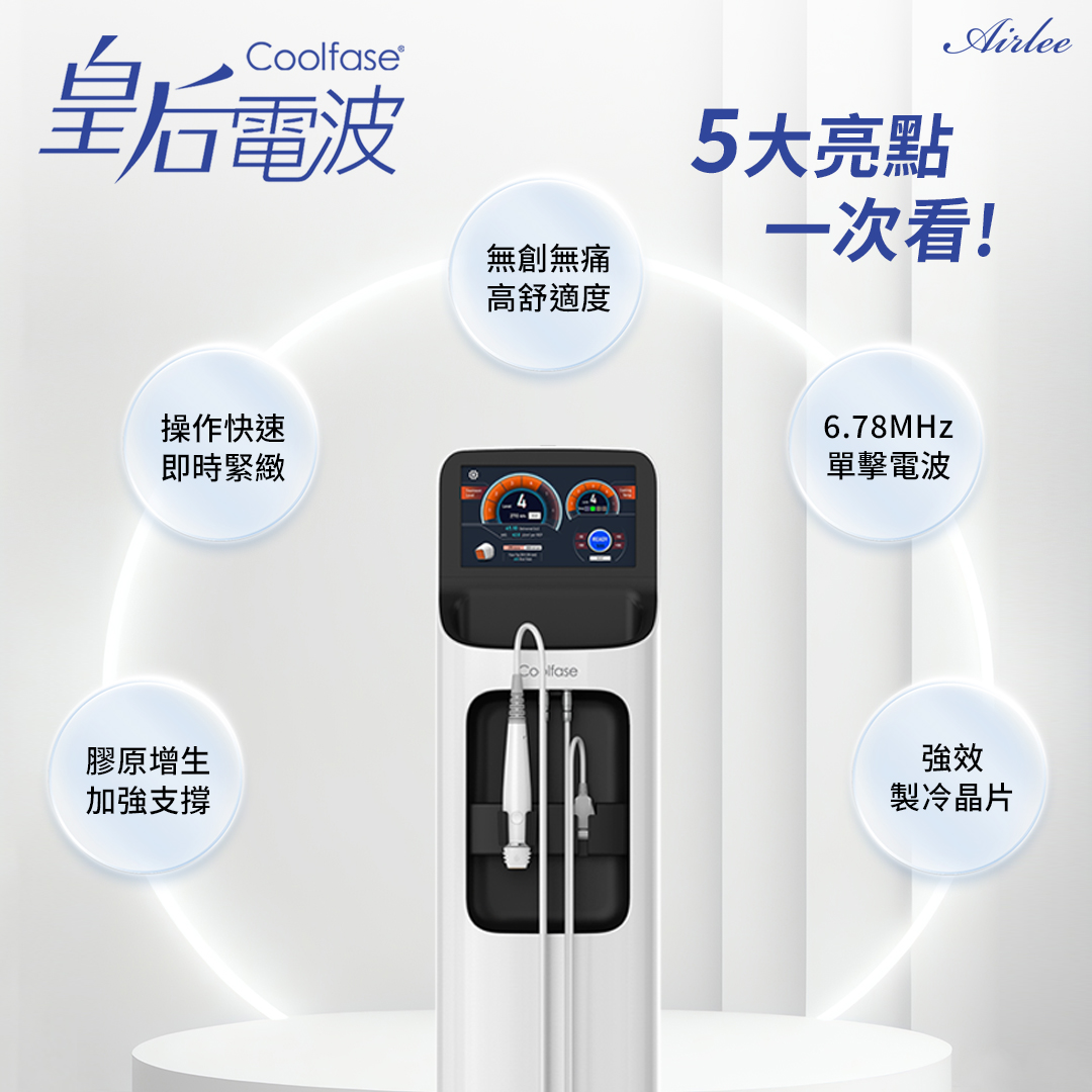 Coolfase電波可以有效刺激膠原蛋白和彈力蛋白的新生與重組,從肌底改善膚質。擁有媲美市面上熱門電波的緊緻拉提、撫平皺紋的效果。