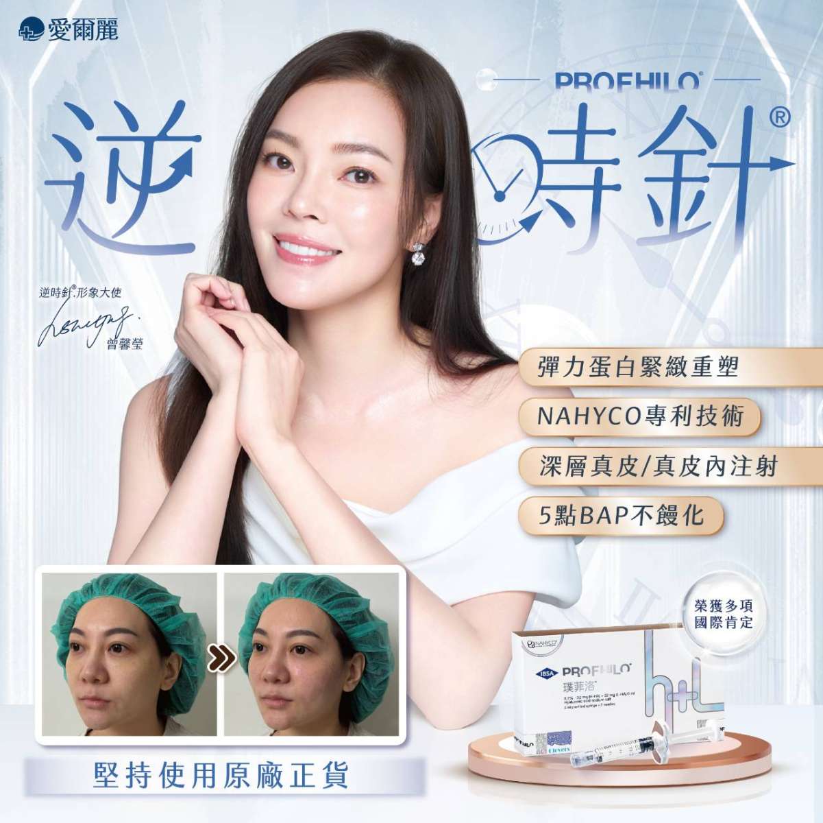 #逆時針Profhilo 名媛 #曾馨瑩 的保養秘訣 彈力蛋白緊緻重塑,讓皮膚透亮、緊緻、立體 ■ NAHYCO專利技術,堅持使用原廠正貨 ■ 深層真皮/真皮內注射,從根源改善老化問題 ■ 5點BAP不饅化,術後照護便利 「讓時間溫柔倒轉,喚回最美的自己。」