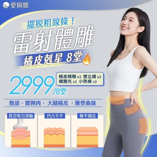 雷射體雕 橘皮剋星 8堂 2999 橘皮精雕 x2|塑立纖 x2|纖體光 x2|小熱褲 x2 讓曲線更勻稱,更細緻 私訊預約雷射體雕 #雷射體雕 #橘皮改善 #體雕療程 #曲線管理 #愛爾麗