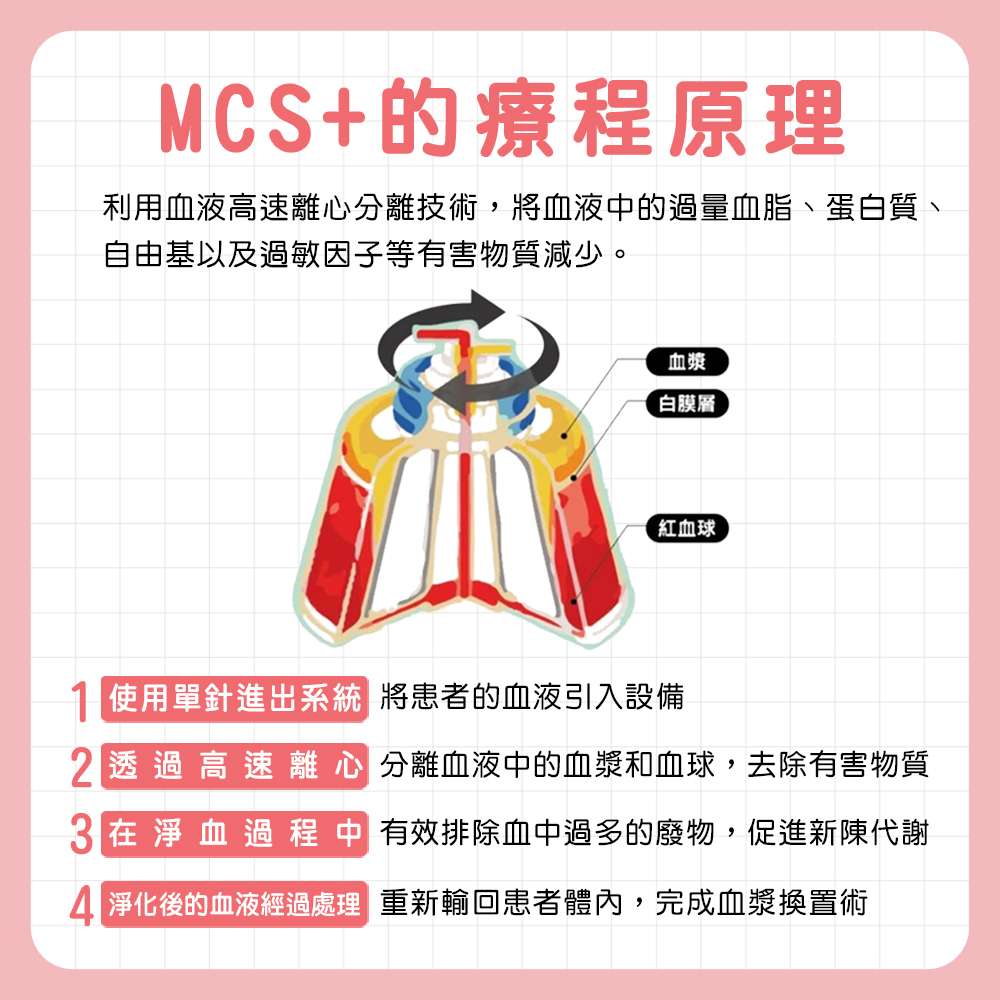 MCS+血漿置換術利用 #血液高速離心 分離技術,將血液中的過量血脂、蛋白質、自由基以及過敏因子等有害物質減少。有效 #增加血液攜氧量,加速了自體 #新陳代謝,從而達到 #身體活化 的效果。