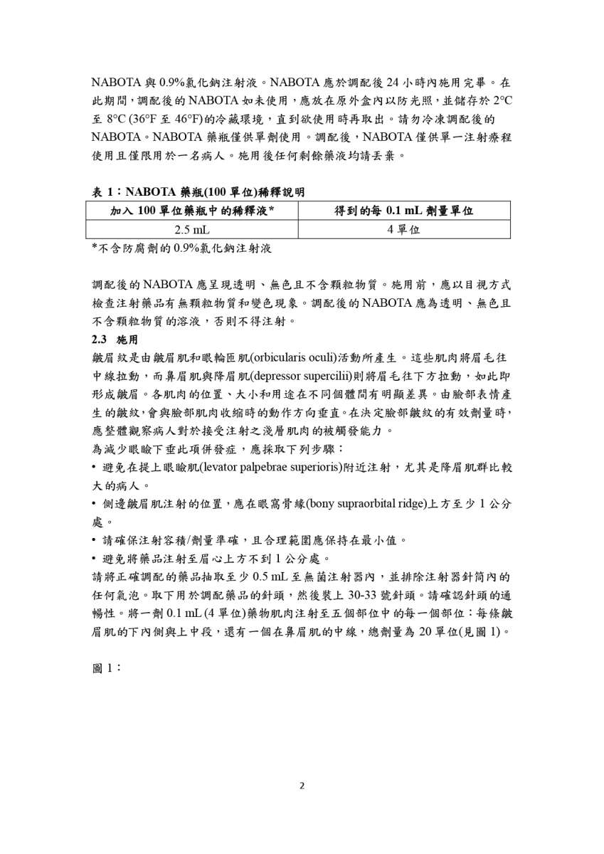 1. NABOTA的效價單位,對於所採用的製備與分析方法具有專一性。效價單位無法與其他肉毒桿菌毒素藥品的製劑相互替換;因此NABOTA的生物活性單位無法與利用任何其他專一性分析法評估的任何其他肉毒桿菌毒素藥品單位作比較或換算。