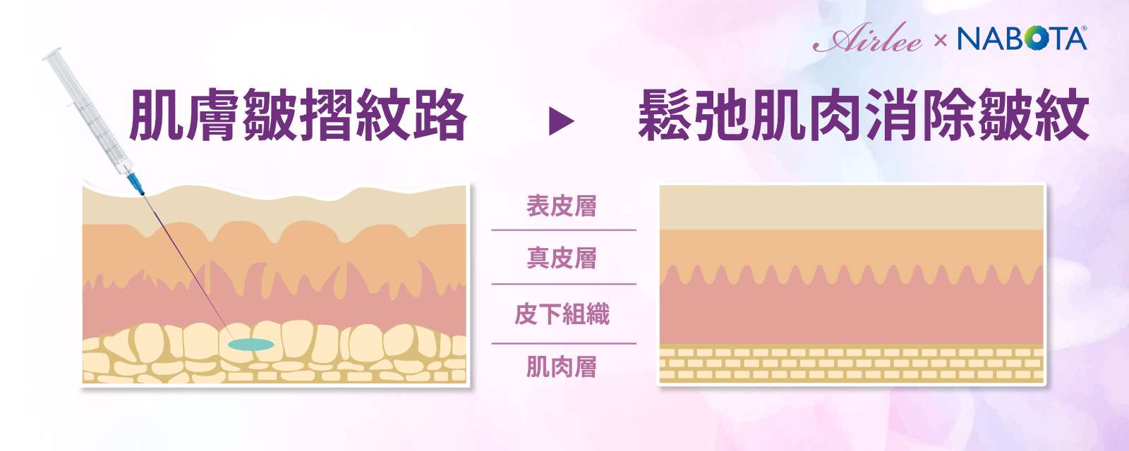 NABOTA的主成份Botulinum Toxin Type A是一種乙醯膽鹼釋放抑制劑,與運動神經末梢上的接受位結合、進入神經末梢內,阻斷神經末梢釋放乙醯膽鹼素,令造成皺紋的肌肉放鬆,達到放鬆肌肉以清除因臉部肌肉過度活動而產生的動態性皺紋。