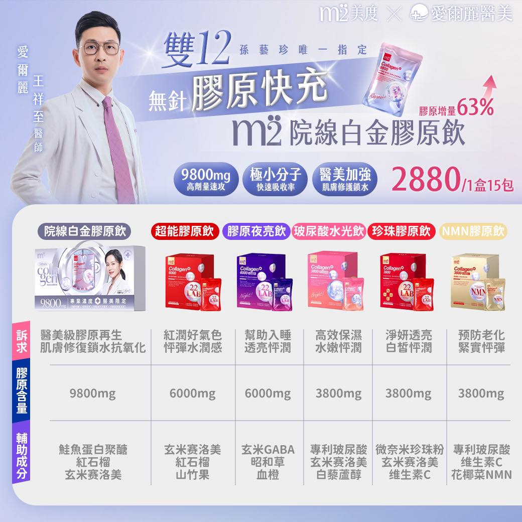 m2膠原蛋白-醫美白金高規版 ❤️ m2美度 x 愛爾麗醫美💜 韓國凍齡女神孫藝珍唯一指定 ✨ 最懂肌膚的💓 m2膠原飲 全新升級⤴️增量63% 無針膠原快充⭐美麗續航更長效⭐ 放大醫美效果「高效補足是關鍵」‼️ 鎖住美麗配方✨交給無針注入式膠原
