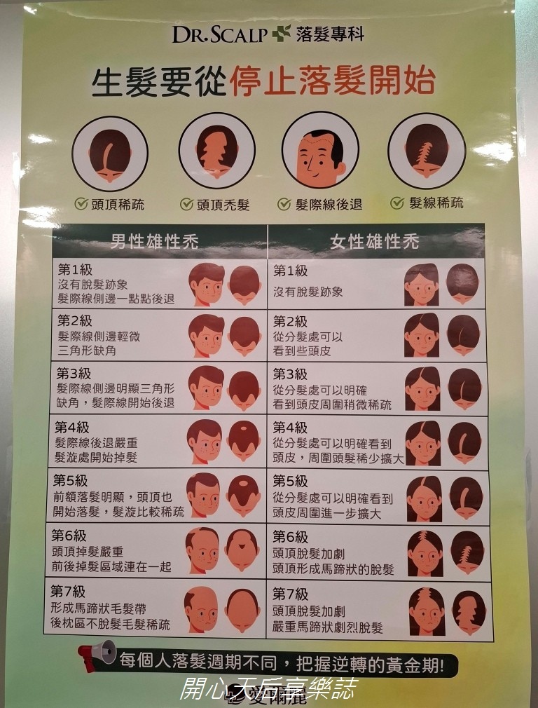 目前我的秃頭等級介於第3級~第4級,必須及早預防保養,還好,我及時來做「頭皮拉髮密雷射」